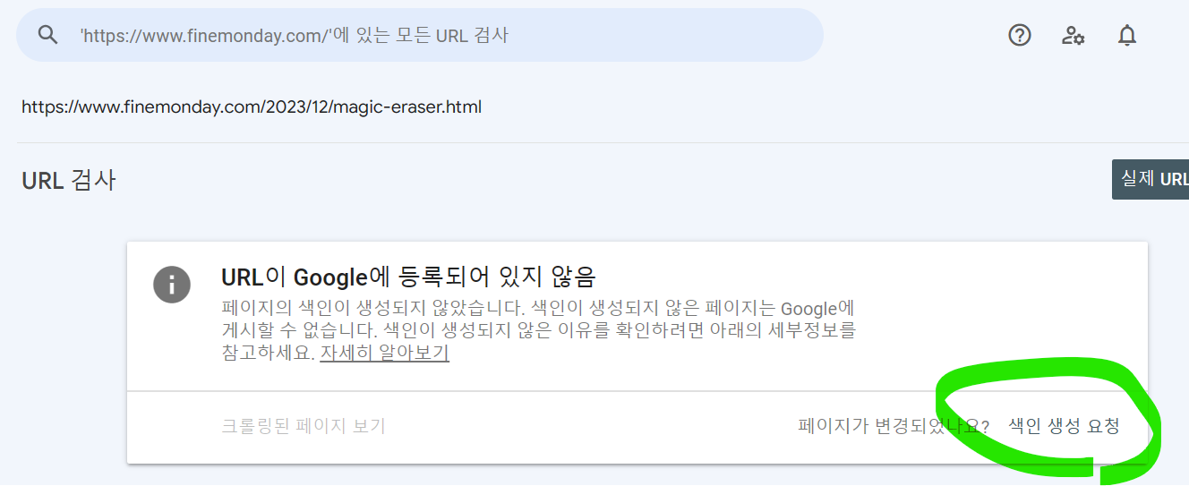 ‘URL이 Google에 등록되어 있지 않음’으로 나오는 경우 우측 하단의 ‘색인 생성 요청’을 클릭하여 수동으로 색인해준다.